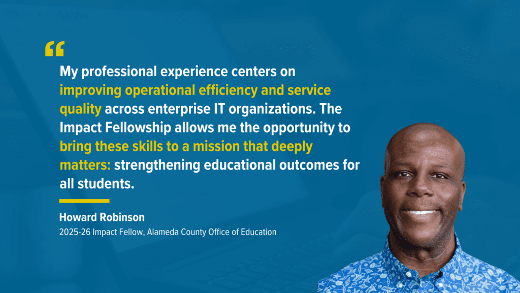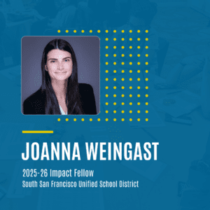 Seven 2025-26 Impact Fellows are supporting school districts and nonprofits across the Bay Area: Alameda County Office of Education, Families in Action, NewSchools Venture Fund, and South San Francisco Unified School District.